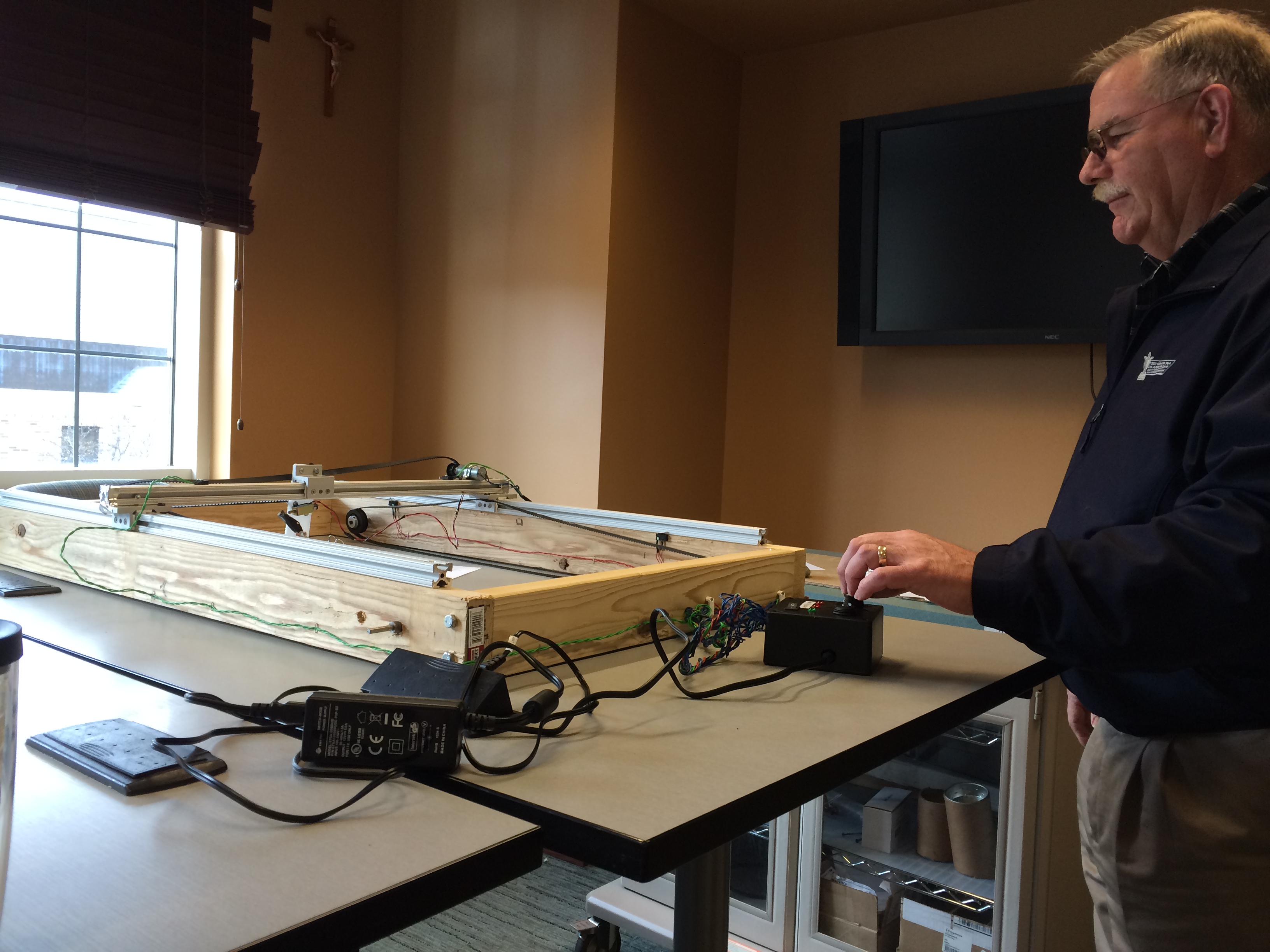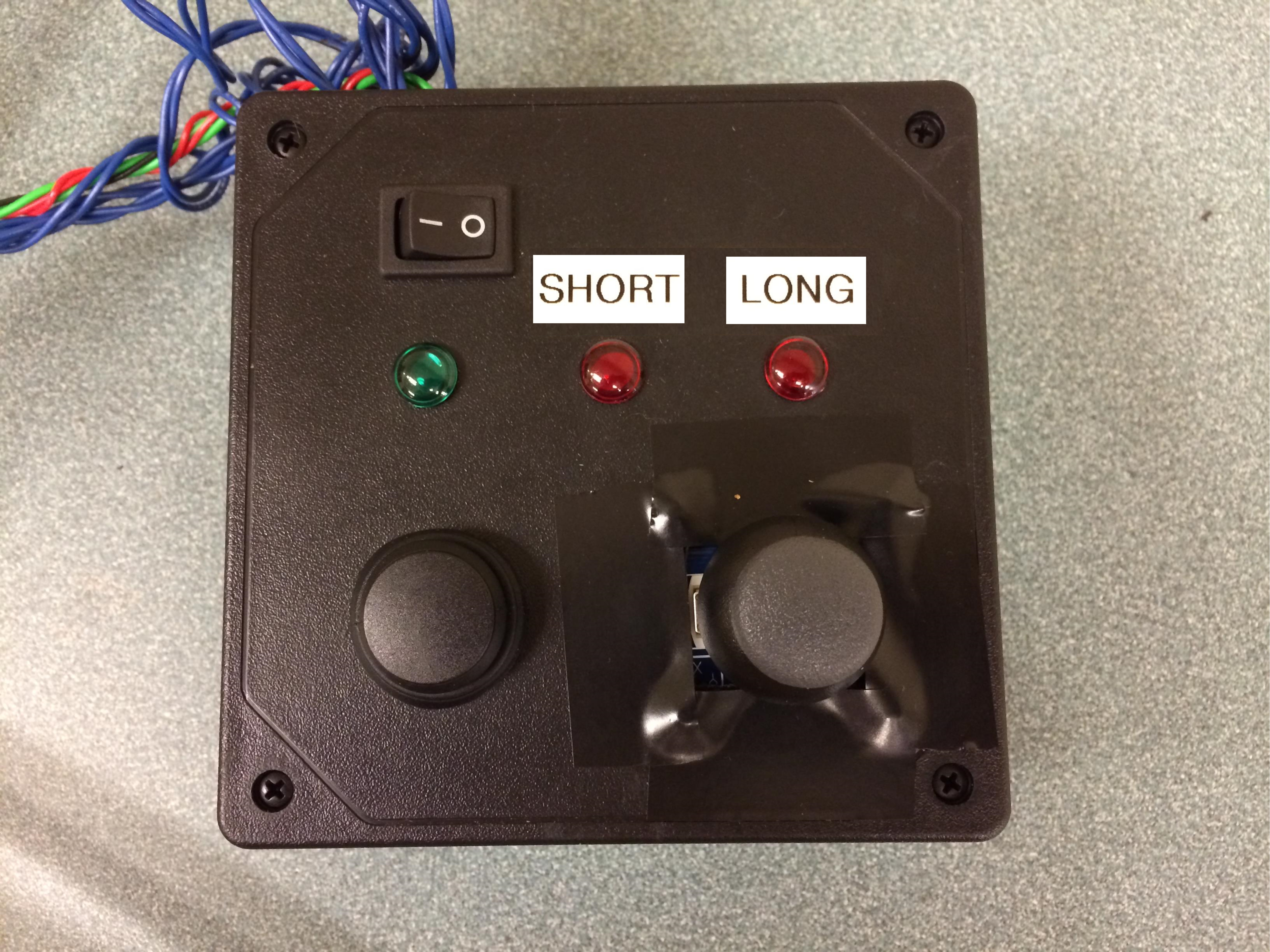 The user interface includes a joystick that controls the x and y motion of the motor, including speed control. LEDs indicate power and when the pen reaches the end of the track in both directions. A button controls when the pen is lifted.