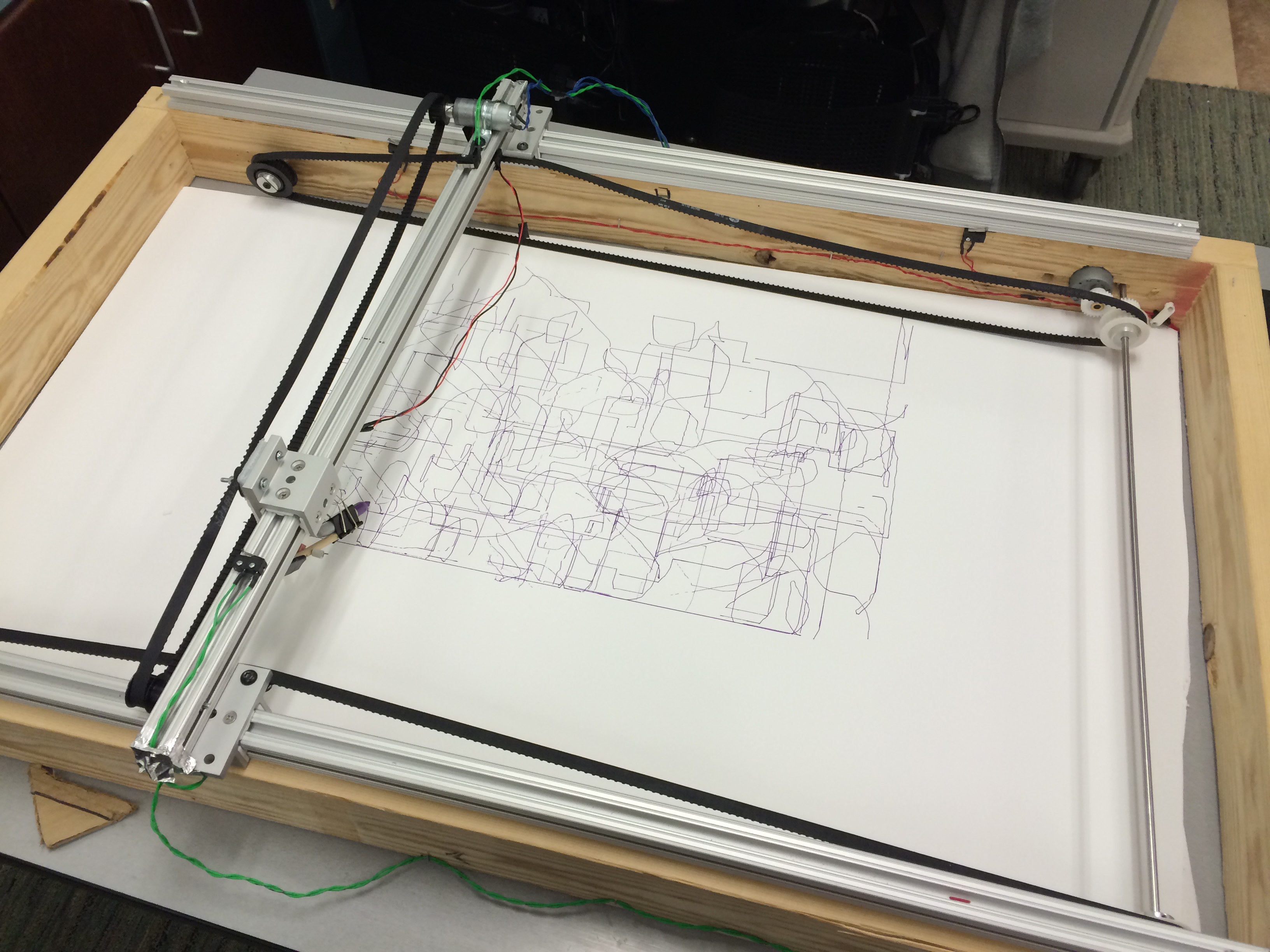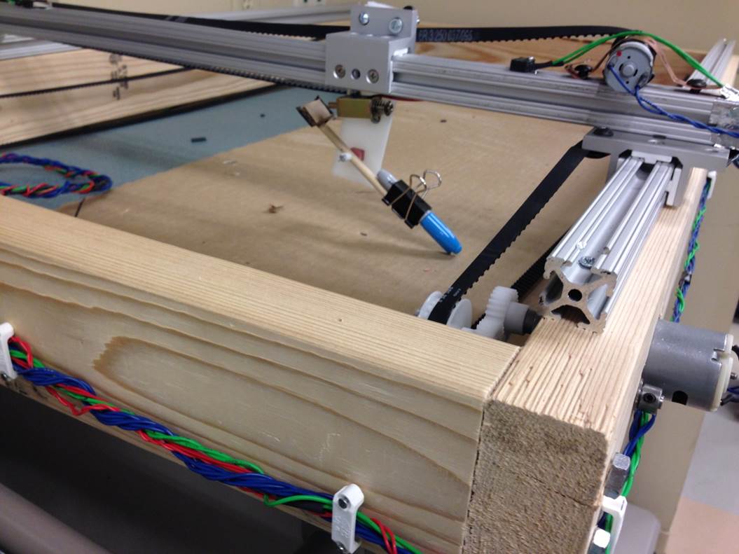 The X-Y plotter is constructed using three T-frames, mounted on a wooden frame. A solenoid is used to lift and lower the pen. Both sides of the long axis have a belt in order accurately track the color dispensing carriage.