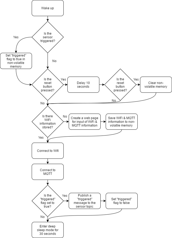 Once installation is complete, each sensor should be set up at entry points or monitoring rooms so that any unwanted movement or action will be detected. For example, an entry sensor on a back window. If this window is opened or broken, the one-shot chip on the board will register a state change, and send a reset pulse to the ESP to wake it from sleep. Once awake, the ESP will check the state of a pin monitoring the sensor. If the sensor is triggered, in this example an open circuit, then it will write a ‘triggered’ value to memory and attempt to connect to WiFi. This memory writing is done so that if the chip is reset while attempting to connect to WiFi, for instance if the entry sensor was on a door and it was closed seconds later, a ‘triggered’ message will still be sent when the ESP is able to connect.