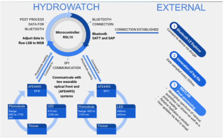 1. The first subsystem is the detection of hydration in the body. This detection will be implemented through the use of LEDs to optically measure the amount of water, electrolytes, and other substances present in the tissue, which change based on the hydration of the user. We used four different surface mount LEDs and two Analog Front End (AFE) devices to communicate and measure light absoption within the skin.